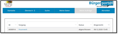 Wenn Sie sich im Bürgerportal anmelden, können Sie unter „Meine Aufträge“ Ihren aktuellen Auftragsstatus nachverfolgen. Sie erhalten zusätzlich eine Information per E-mail wenn sich der Bearbeitungsstand ändert.